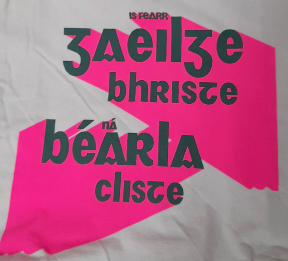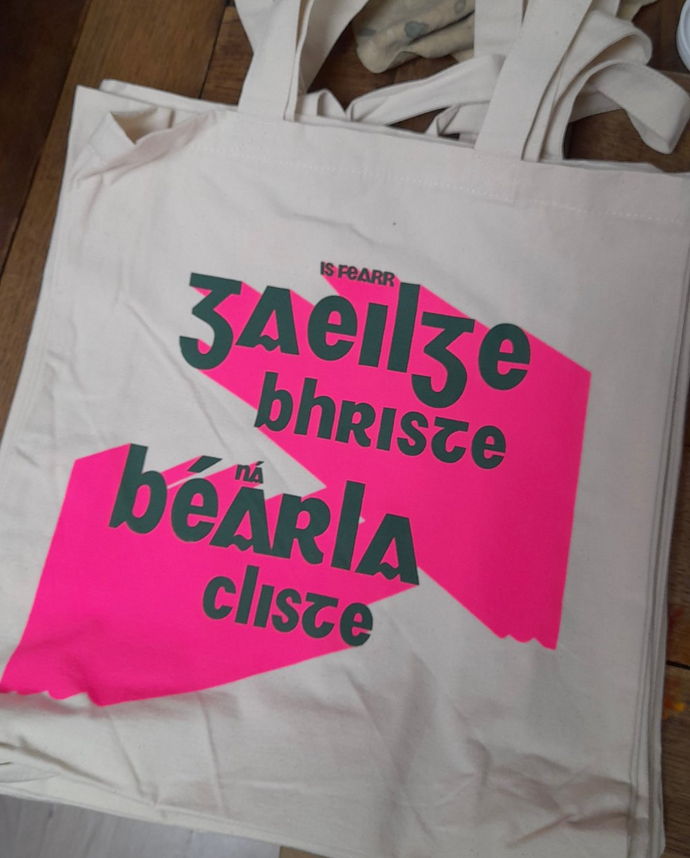 Hand screen printed 'Gaeilge Bhriste' tote bag on natural cotton, heavy duty material. Neon pink & teal colourway.