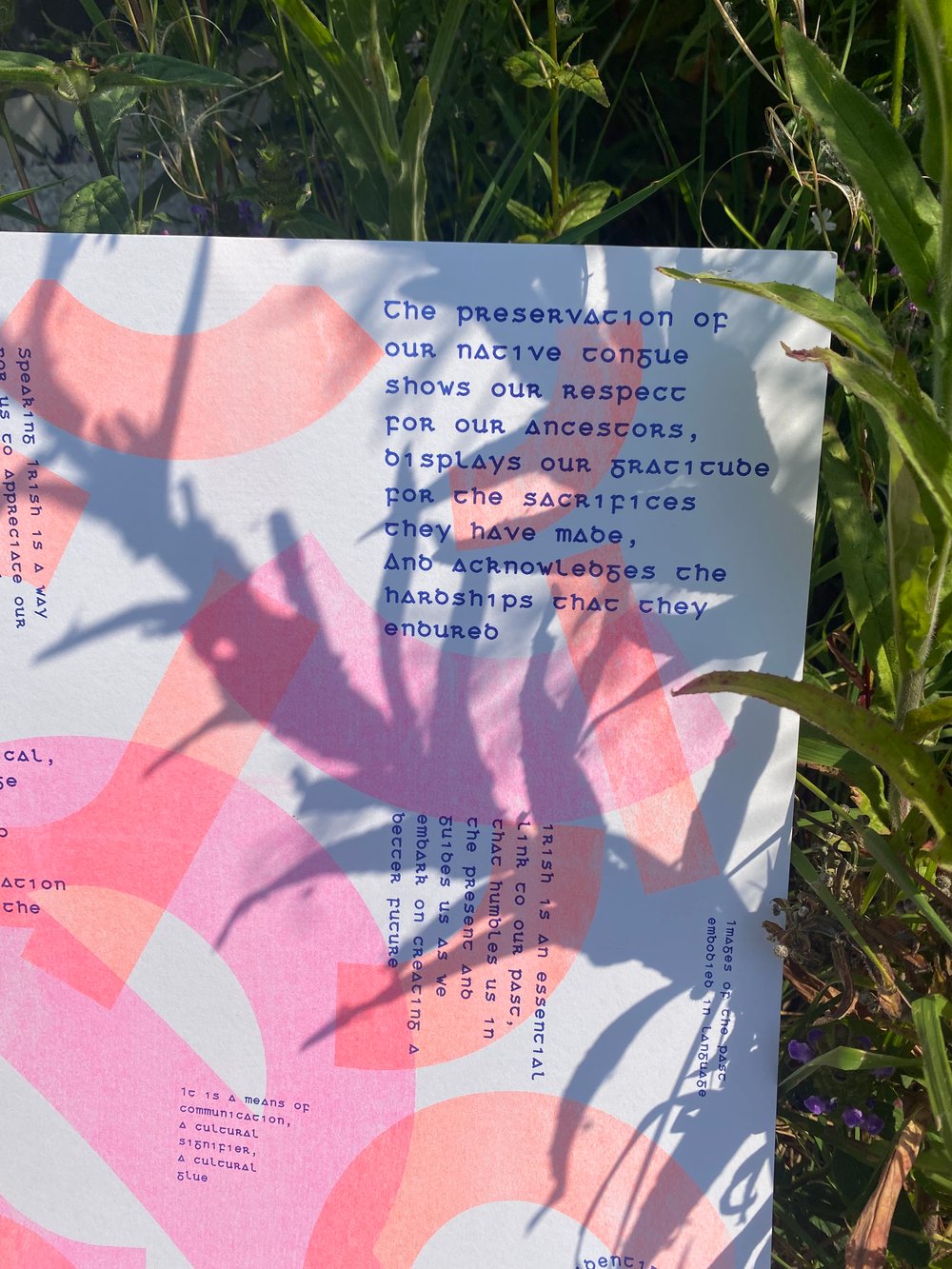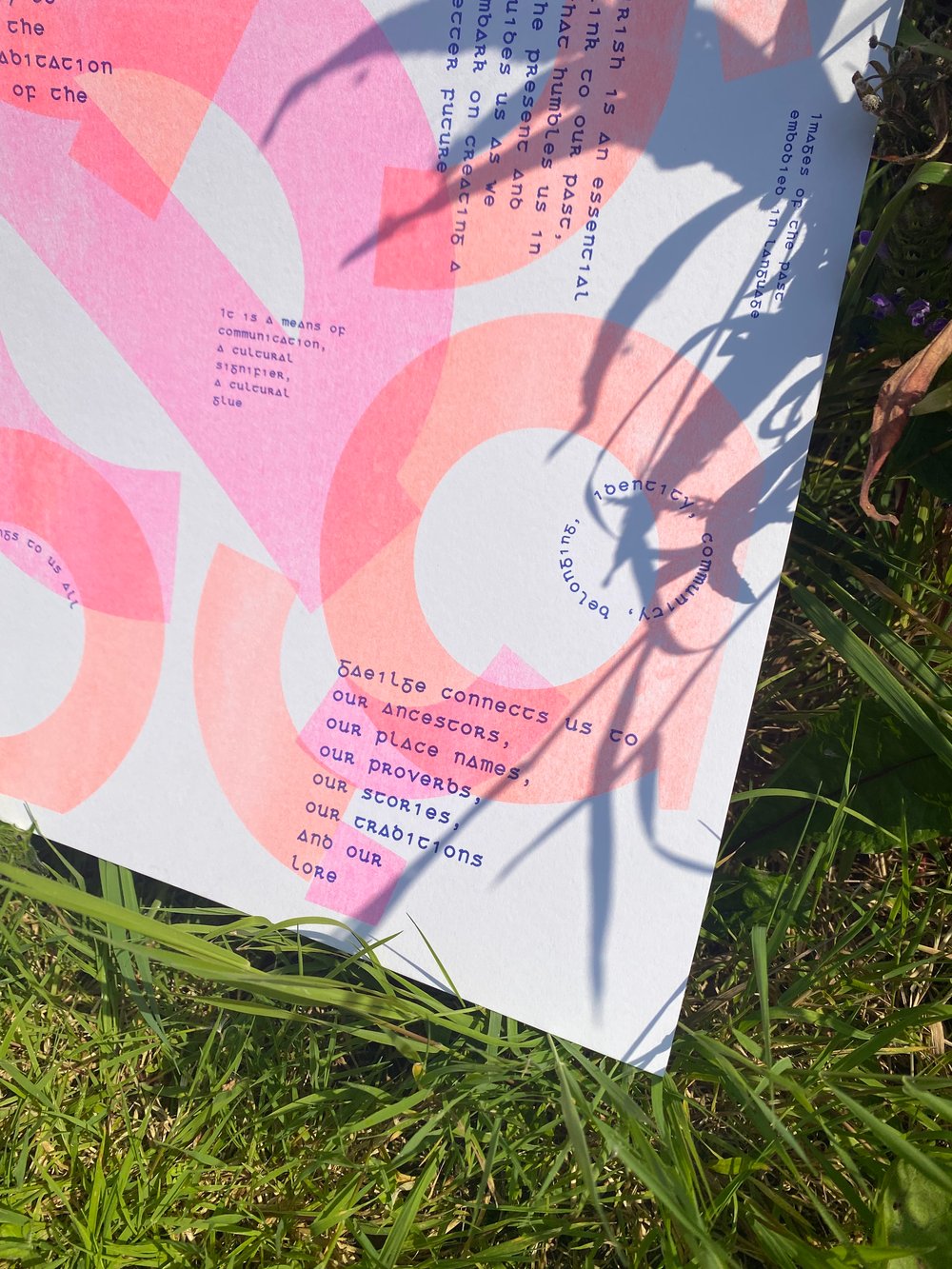 'Gaeilge Connects Us' is a 3 colour risograph print which uses old Irish typography to communicate the words of Gaeilgeoirí as they tell us of the beauty and importance of the Irish language.
